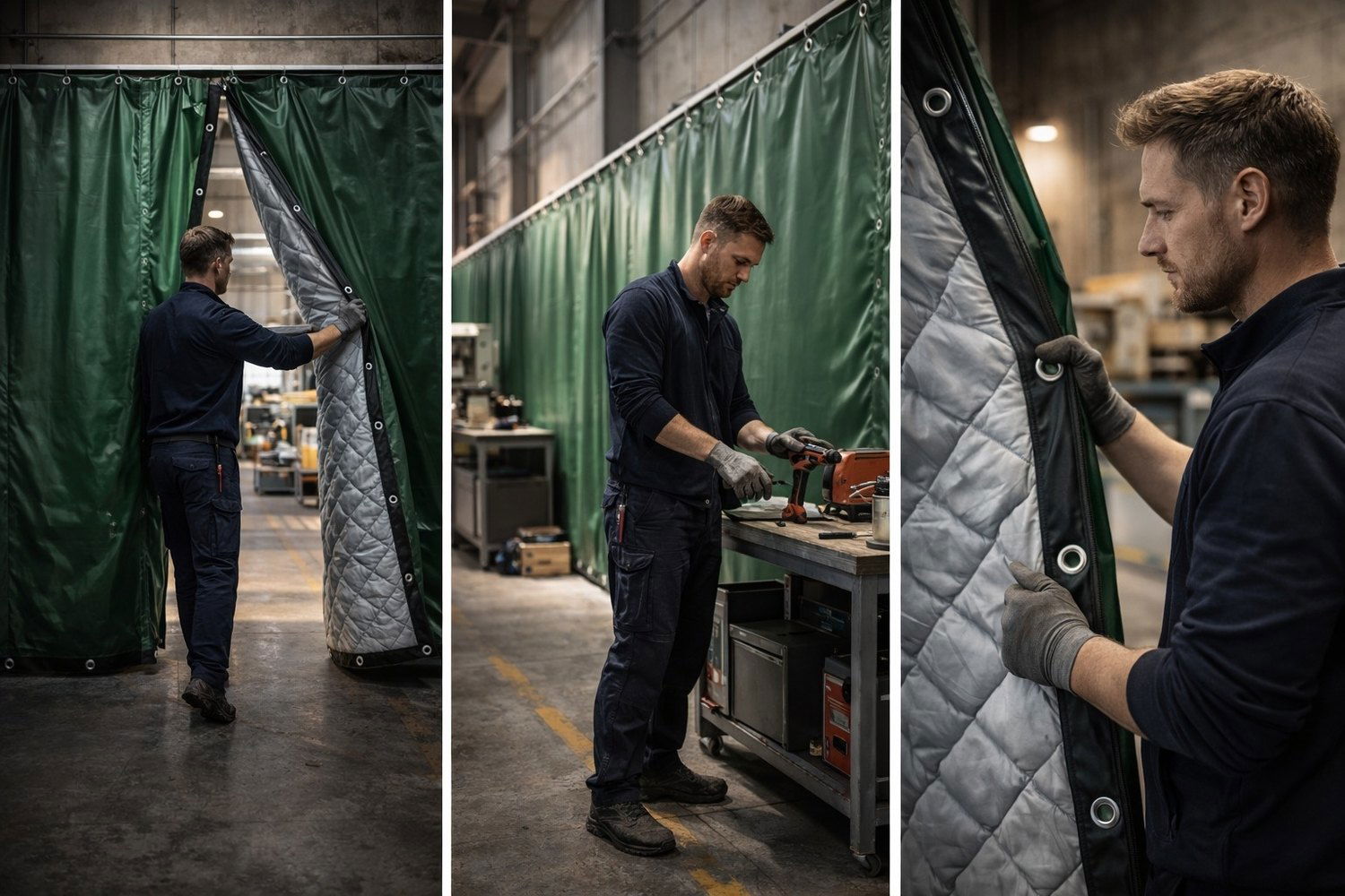 SilentDirect Sound Barrier är mer än ett traditionellt ljuddämpande draperi. Tack vare sin avancerade flerskiktskonstruktion kombinerar det ljudisolering och ljudabsorption i samma produkt. Ytterskiktet består av en slitstark PVC-duk med armerad väv som gör bullerskyddet vattentåligt, UV-beständigt och mycket tåligt mot slitage. Innanför detta finns ett lager av 3 mm mass loaded vinyl (MLV) som fungerar som ett ljudisolerande draperi och effektivt stoppar luftburet ljud. Mellanskikten består av polyesterbaserad ljudbarriärfoam och fiberfyllning som reducerar efterklang och fungerar som ett ljudabsorberande draperi. Konstruktionen förstärks med glasfiberduk för extra stabilitet. Resultatet blir ett akustikdraperi som levererar både effektivt ljudskydd och lång hållbarhet även i krävande miljöer.